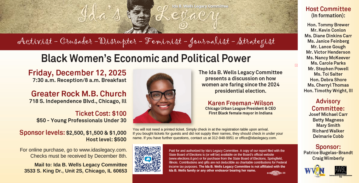 Wilson-Freeman will join the Ida's Legacy Black Women's Economic and Political Power Breakfast, Friday, Dec. 12, 2025 at Greater Rock Missionary Baptist Church, 718 S. Independence Boulevard, Chicago, Ill to discuss in-depth how women are faring under the current presidential administration. For ticket information, visit www.idaslegacy.com or call 312-948-9951.