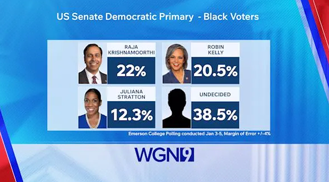 Emerson College just yesterday released the first public poll in this race, and one trend is clear: Lieutenant Governor Juliana Stratton is failing to gain steam. Not only is she polling below 10% – she is losing Black voters. Rep. Raja Krishnamoorthi, an Indian American, is leading that demographic, followed closely by Rep. Robin Kelly. In distant third – Juliana Stratton.
