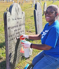 DAR Member and Rhode Island State Regent Dymond Bush cleans a historical headstone in honor of her two Revolutionary War Patriots of color. Daughters of ā¦