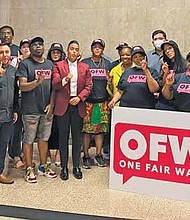 Supporters of One Fair Wage, along with 26th Ward Alderman Jessie Fuentes at City Hall. PHOTO PROVIDED BY ONE FAIR WAGE.