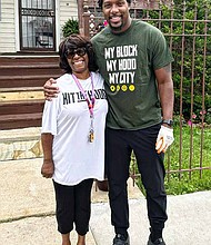 Jahmal Cole, founder of My Block My Hood My City, with a community member. Cole and the organization have been providing food for seniors through …