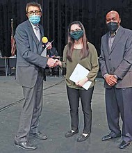 Team Alattis won the grand prize of $10,000 with a modern solution to virtual and hybrid videoconferencing. From left to right: Gina Battagliola, Nick Cannon, …
