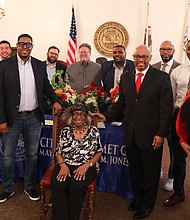 Ms. Eula Bell Lofton Is Joined By Calumet City Mayor Thaddeus Jones And Other Calumet City Council Members, Family And Supporters. Photo provided by STH …