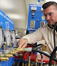 Former South Suburban College student adjusts a hydraulic instrumentation module.