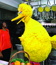 Michelle Obama participates in a Let’s Move! and Sesame Street public service announcement taping with Big Bird in the White House Kitchen, 2013.