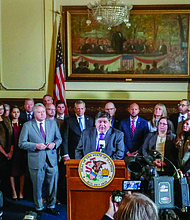 Gov. J.B. Pritzker speaks Thursday, Nov. 14 during a news conference at the Capitol in Springfield about the General Assembly’s passage of legislation to consolidate …