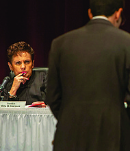 Illinois Supreme Court Justice Rita Garman listens to oral arguments being made by Assistant Appellate Defender Zachary Rosen in the People v. Morger case Sept. …