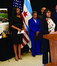 Amy Jordan (middle), manager of the driver license unit for the Illinois Department of Healthcare & Family Services, joined state Rep. La Shawn Ford (D-8th) …