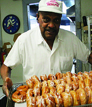 Buritt Bulloch, founder and owner of the Old Fashioned Donuts shop, shows off his famous glaze donuts he makes from scratch daily at his South …