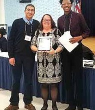 Bremen High School District 228 students Alonzo Arostegui (left) Jamal Cole (right) presented SSC’s Dr. Anna Helwig, Dean of STEM, with a Board Recognition Award …