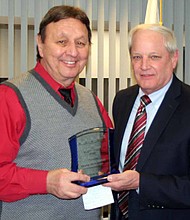 South Suburban College Chairman Frank M. Zuccarelli (left) and Mike Monaghan(right) of the ICCTA who attended South Suburban College’s recent Board Meeting to present Chairman …