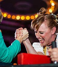 From (left to right) Oktober FIST vs. Elizabeth WarZone at the Chicago League of Lady Arms Wrestlers’ CLLAW XXXI match at Logan Square Auditorium. Photo …