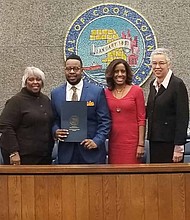 Early Walker (second from left), owner and CEO of W&W Towing, was recently honored by the Cook County Board of Commissioners. Photo Credit: Provided by …