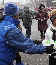 Alderman David Moore (in blue) passes a turkey to Cheryl Taylor, McDonald’s franchise owner, at the 19th annual turkey giveaway sponsored by the Black McDonald’s …
