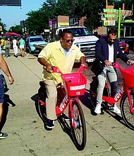Alderman Roderick Sawyer and Ahmad Elkhatib, owner of A&S Beverages, recently rode Uber Jump bikes at Dining on the 5, a community engagement effort currently …