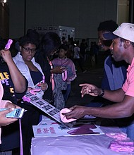 Ernst Lamothe Jr. Passes out poster boards and headbands at the Pink Out Events at SD 215 TF North High School
