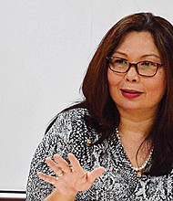 Lisa Cooper, community relations specialist at State Farm, explains during National Teen Driver Safety Week that teens should “drive two-and-two, which means two eyes on …