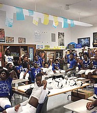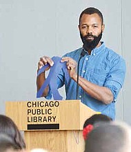Author and Illustrator Javaka Steptoe conducts a art workshop in front of 300 hundred students at the Harold Washington Library Center. Photo Credit: Christopher Shuttlesworth