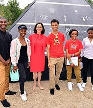 olar Spotlight students join Anne Pramaggiore, president and CEO of ComEd, in front of ComEd’s Solar Spotlight Pyramid, which was unveiled on receently, at Gallery …