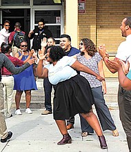 Staff members of the Noble Network of Charter Schools join elected officials and community members in welcoming freshmen students.