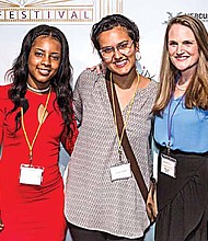Franhsay Lopez (left) poses with her DePaul film mentor Serena Hodges (center) and Program Director Liliane Calfee (right), at the screening of their documentary film …
