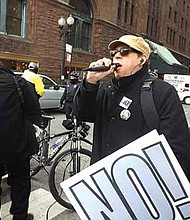 Tedd Sirot, Initiator for the Refuse Fascism group in Chicago speaks at a recent protest held at the Chicago Club located in the loop. Photo …