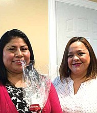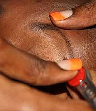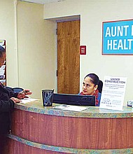 Yvonne Carter (standing), a patient at the New Roseland Community Hospital's Primary Health Care Center signs in, while Patricia Ramierz (seated), a Medical Office Assistant …