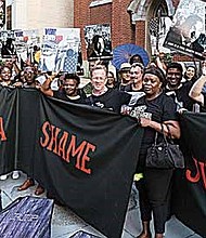 Rabbi Batya Steinlauf, Imam Talib Shareef and Dr. Stephanie Myers, co-founder of Black Women for Positive Change, address a press conference on the issue of …