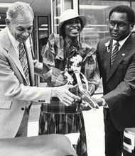Ribbon cutting ceremony in front of the new Chicago Urban League Headquarters, 4510 S. Michigan Avenue (at Grand Boulevard). Bill Berry is on the left. …