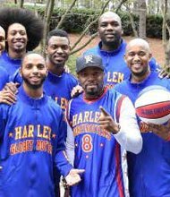 Grammy Award-winning producer/songwriter Teddy Riley, no. 8, poses with the Harlem Globetrotters. (PRNewsFoto/Harlem Globetrotters)