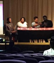 The seven panelists addressing the crowd: (From left to right) Ali N. Muhammad, administrator at John Harlan Community Academy; Carol R. Washington, enrollment coordinator at …