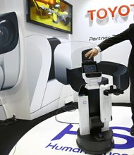 In this Dec. 2, 2015 photo, Akifumi Tamaoki, general manager of Toyota Motor Corp.’s partner robot division, demonstrates Toyota partner robot HSR, or Human Support …