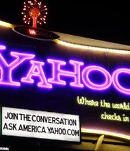 In this Oct. 4, 2010 file photo, a Yahoo signboard is displayed in San Francisco. Shares of Yahoo are up sharply before the opening bell, …