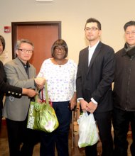 L- R Ald. Michelle Harris; Samuel Kim, Chade Foundation; Claudine Porter, resident and Kwon Young and Martin Kang of the Chade Foundation presented turkeys and …