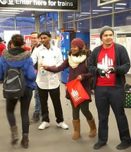 High school students Daniel Mercado and Heaven Johnson and students from the Illinois Art Institute pass out condoms and other goodies at the Roosevelt Train …