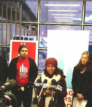 Heaven Johnson, a senior at Lindblom Math, speaks to the press as Mather student Daniel Mercado and Commissioner of Public Health, Julie Morita are in …