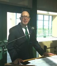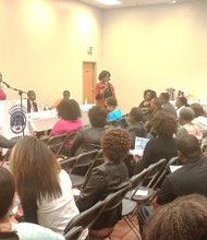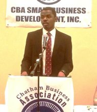 Alexander Buckles, Supplier Diversity Analyst for the McCormick Place in Chicago, speaks during the Chatham Business Association (CBA) monthly meeting on Tuesday, Oct. 13, 2015 …