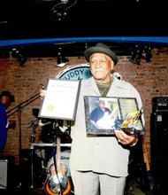 “Sir” Walter Scott proudly displays his award and plaque after he was inducted into the Chicago Blues Hall of Fame on Oct. 4, 2015.