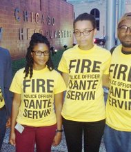 Members of Black Youth Project 100 wear t-shirts demanding the firing of Chicago police officer Dante Servin.