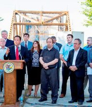 Ill. State Rep Bob Rita (Dist.-28th) and Blue Island Mayor Domingo Vargas, along with several other officials, announce plans for the Division Street Bridge in …