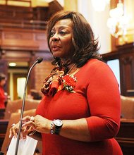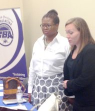 Karen Williams and Priscilla Cordero, director of the Illinois Small Business Development Center, Governors State University, talk to business owners about an outreach center at …