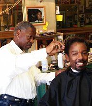 El-Hajj Elshabazz, who is being honored as a long-time barber, cuts his son, Damon Williams' hair. Williams also is a barbar at Truth and Soul …