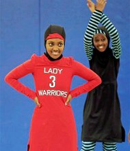 In this June 16, 2015 photo, Zubeda Chaffe, left, waits to get back into basketball practice in her new Lady Warriors uniform in Minneapolis. The …