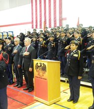 U.S. Senator Dick Durbin (IL-D) (middle right) and Chicago Mayor Rahm Emanuel reflect during the playing of the National Anthem at Phoenix Military Academy, 145 …
