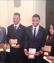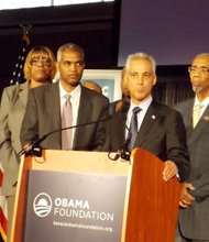 L-R Barack Obama Foundation Chairman, Martin Nesbitt; Chicago Ald. Pat Dowell, (3rd Ward) Chicago Mayor Rahm Emanuel and U.S. Cong. Bobby Rush (Dist.1st).