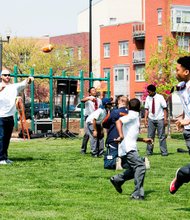 Chicago Bears Pro Bowl offensive lineman Kyle Long throws the football around with youth at the site for a renovation project at Ellen Gates Starr …