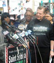 L-R Academy Award nominated director Spike Lee, Faith Community of St. Sabina Pastor Father Michael Pfleger, and actor John Cusack gathered alongside several Englewood community …
