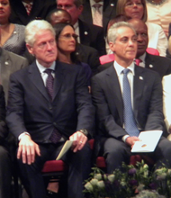 L-R U.S. Senator Dick Durbin (IL-D), President Bill Clinton, Chicago Mayor Rahm Emanuel with wife Amy Rule, daughters, Iliana, Leah, and son, Zachariah.