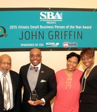 L-R William Garth, CEO, Chicago Citizen Newspaper/Chairman of Chatham Business Association, John Griffin, Jr., SBA’s 2015 Ill.Small Business Person of the Year, Melinda Kelly, Executive …