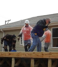 Gary Prescott, (standing center) Exelon vice president of Corporate Compensation, lends a hand in building a West Pullman Windy City Habitat home.